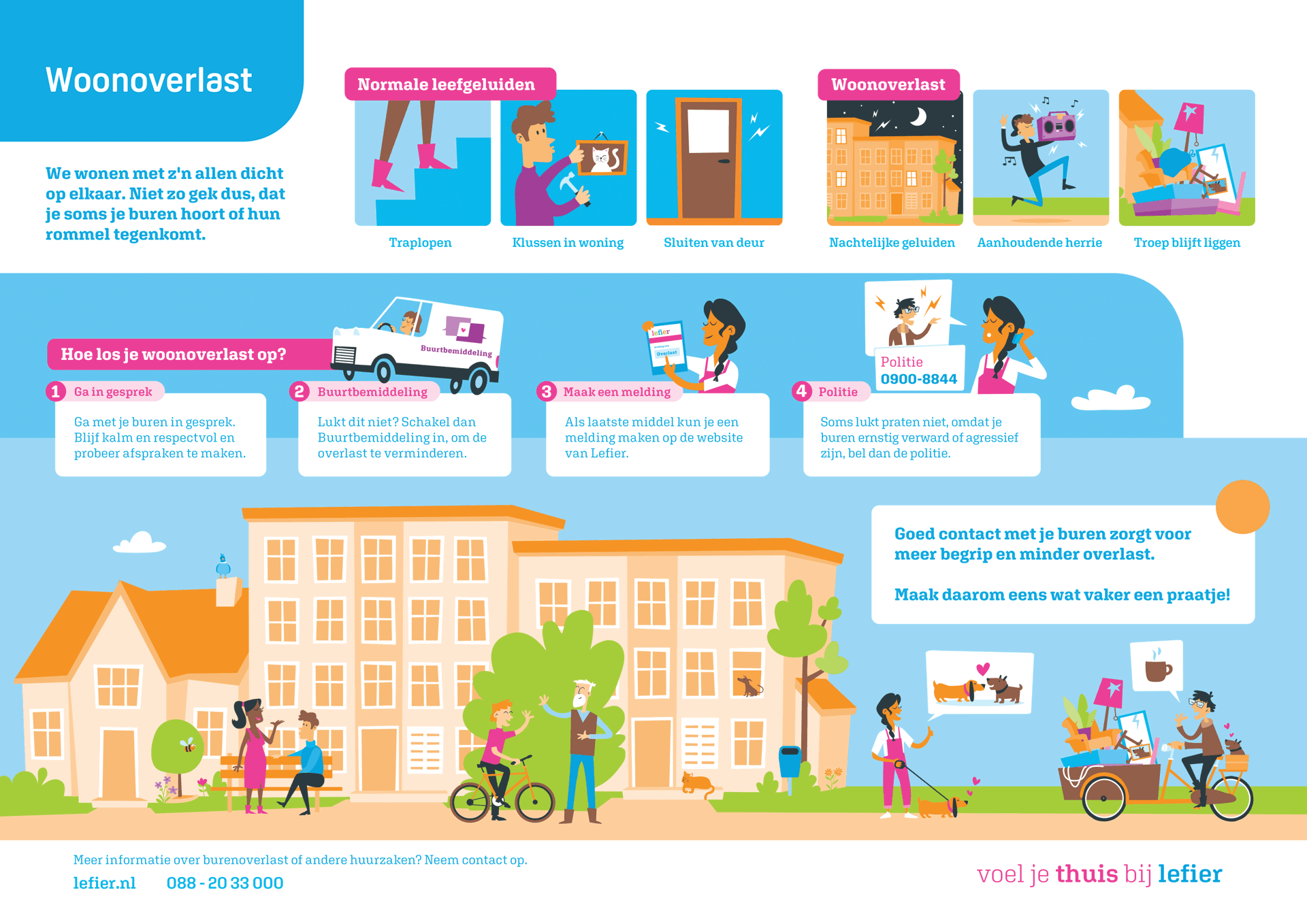 Elke overlastsituatie is weer anders. Wat er ook aan de hand is, praat er met elkaar en met Lefier over. U huurt van ons en wij willen graag het wonen voor u zo prettig mogelijk maken en houden. Dat kunnen we niet alleen, dat doen we samen!