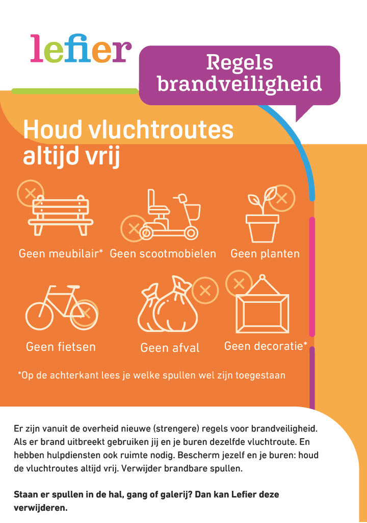 Medewerkers van Lefier en van de brandweer zijn regelmatig in jouw woongebouw. Als zij spullen zien die er niet mogen staan dan spreken we de eigenaar aan. We vragen vriendelijk om alsnog de galerij of gang vrij te maken. Gebeurt dit niet of is de eigenaar niet bekend? Dan zijn we genoodzaakt om de spullen weg te halen. Dit doen we om te zorgen voor een veilige woonomgeving voor iedereen.