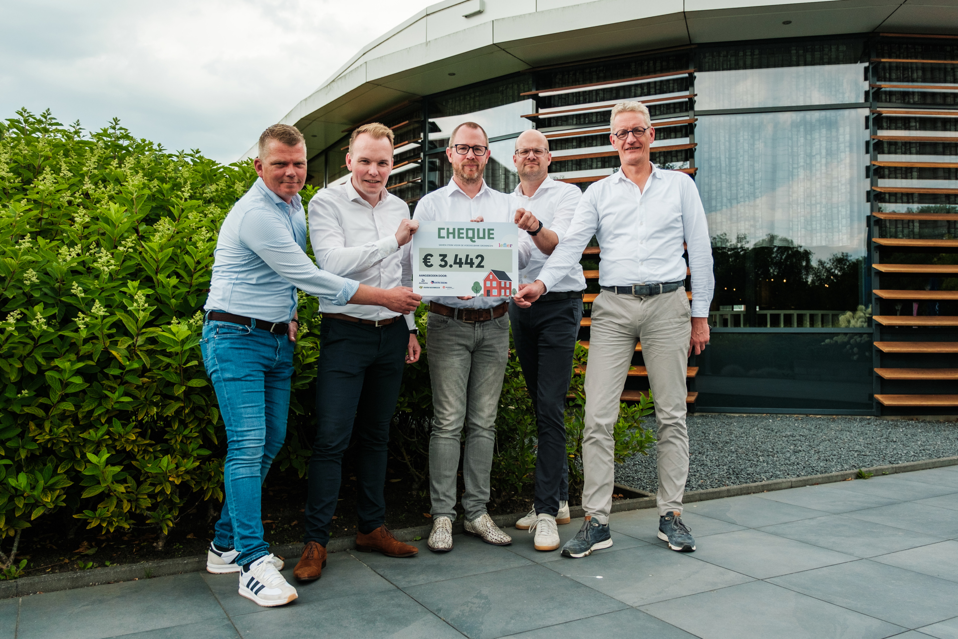 De snelle verduurzaming is mede het resultaat van een nauwe samenwerking van Lefier met vier bouwpartners: Jorritsma Bouw BV, Bouwgroep Dijkstra Draisma, Buursema Bouwbedrijf en Dura Vermeer. Deze week stonden de bouwbedrijven en Lefier kort stil bij het succes: Lefier kreeg van de vier bouwbedrijven een cheque ter waarde van 3.442 euro aangeboden voor een goed doel naar keuze. Dat is Voedselbank Groningen geworden.