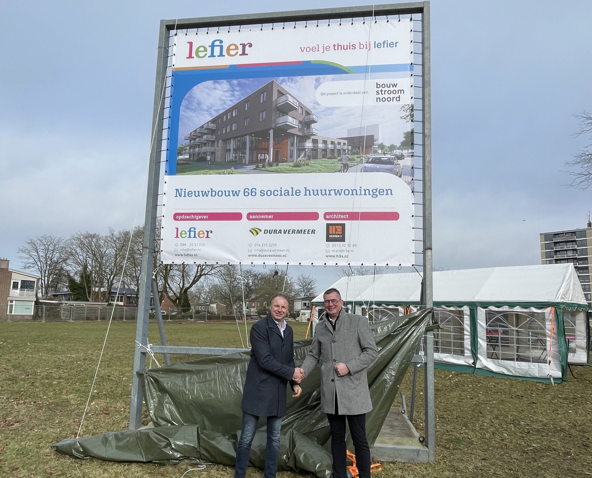 Emmen, 20 februari 2026 - Gisterenmiddag (19 februari) onthulden Pieter Witzenburg, directeur Vastgoed van Lefier, en Raymond Wanders, wethouder van de gemeente Emmen, het bouwbord aan de Haagjesweg in Emmermeer. Daarmee is het zichtbare startschot gegeven voor de bouw van twee identieke appartementencomplexen met in totaal 66 sociale huurwoningen. De nieuwbouw is een belangrijke stap in het investeren in betaalbaar wonen, verduurzaming en leefbaarheid in de wijk.