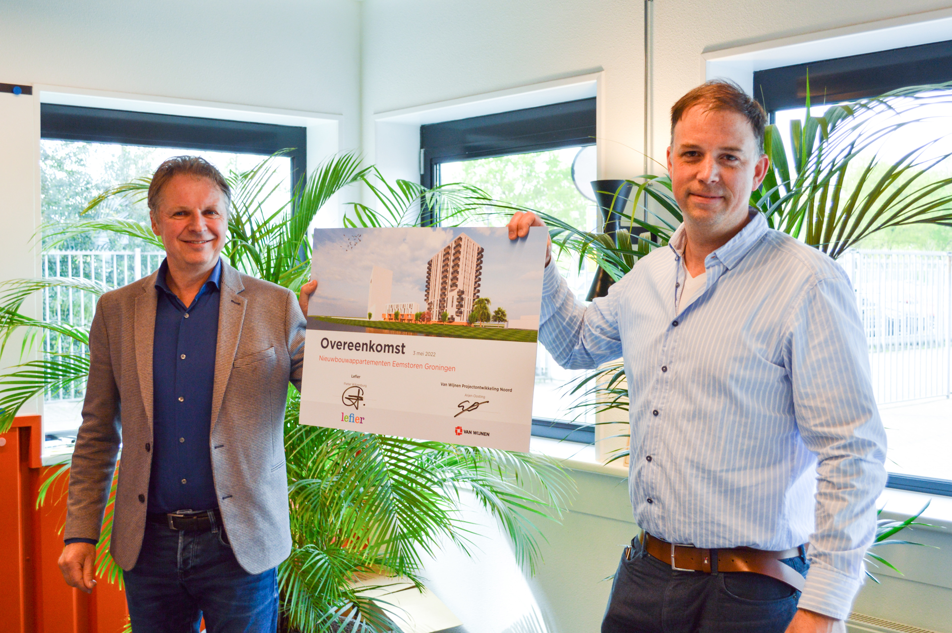Pieter Witzenburg, directeur vastgoed Lefier en Arjen Oosting, directeur Van Wijnen Projectontwikkeling Noord ondertekenen de overeenkomst voor de ontwikkeling en realisatie van 77 appartementen in De Eemstoren in Groningen