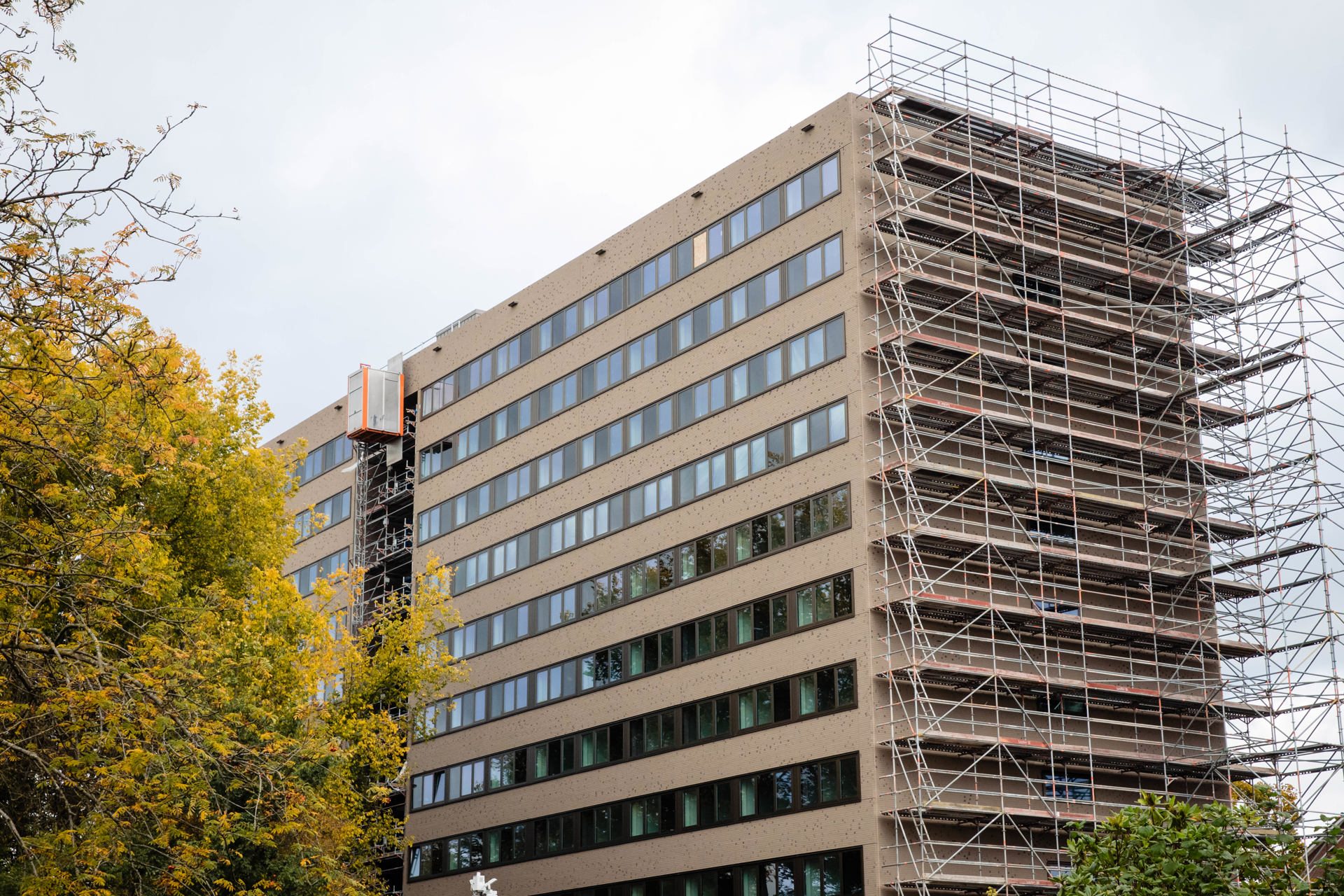 Aan de buitenkant is de studentenflat-nieuwe-stijl afgewerkt met een chocolademelkkleurig baksteenmotief, zodat de wijk ook ziet dat er wat groots en gezelligs gaande is.
