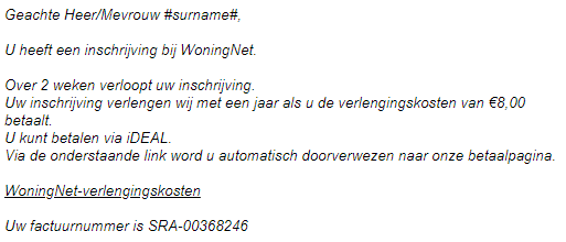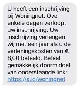 Er worden sms-berichten en e-mails verzonden door een onbekende partij aan woningzoekenden. In het bericht staat dat u de verlengingskosten van uw inschrijving bij WoningNet moet betalen. Volgens het bericht kun je de betaling doen door op de link in de tekst te klikken. Deze berichten zijn niet afkomstig van WoningNet of Thuiskompas!